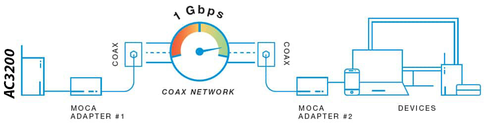MoCA stands for Multimedia over Coax. It uses the existing coaxial cables in your home for the internet. You connect it with the Netgear router and it provides reliable, low latency and high speed internet connection using the cables already in place in your home. To be more precise, once you connect the router to MoCA, it turns the home network into Internet Autobahn and you get internet speeds upto 1 Gbps.